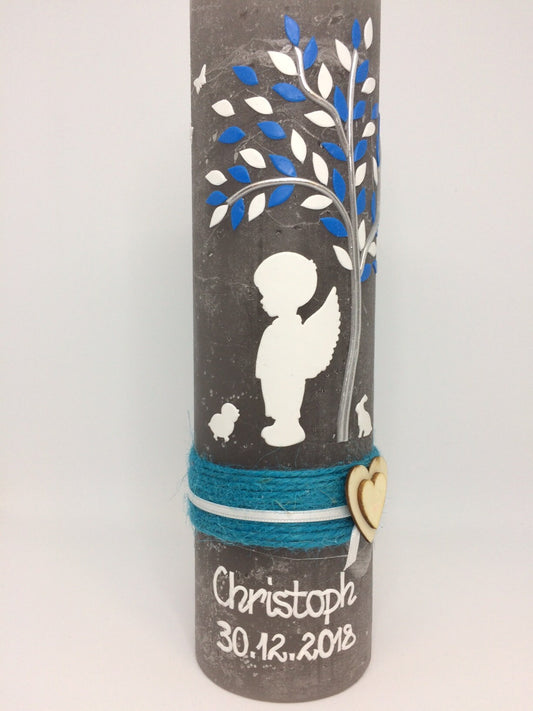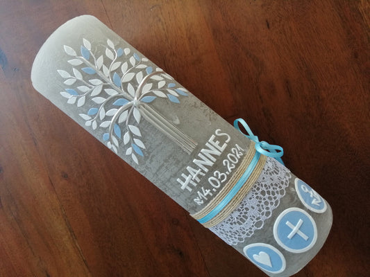 Taufkerze, Lebensbaum, Jungen, Mädchen, Kreuz, Herz, Anker, blau, Rustikal, Rustical, Rustika, Rustica, Vintage-Look, Shabby, Farbwünsche