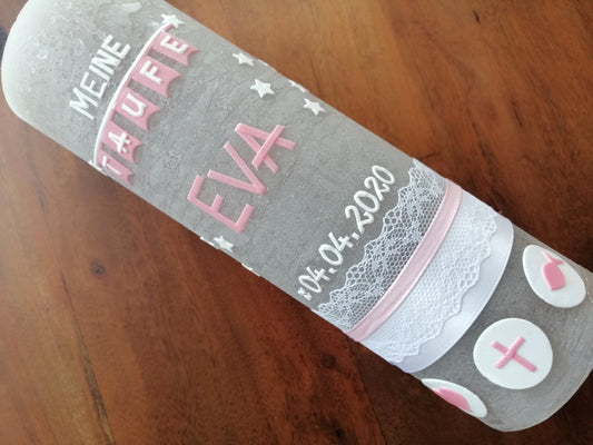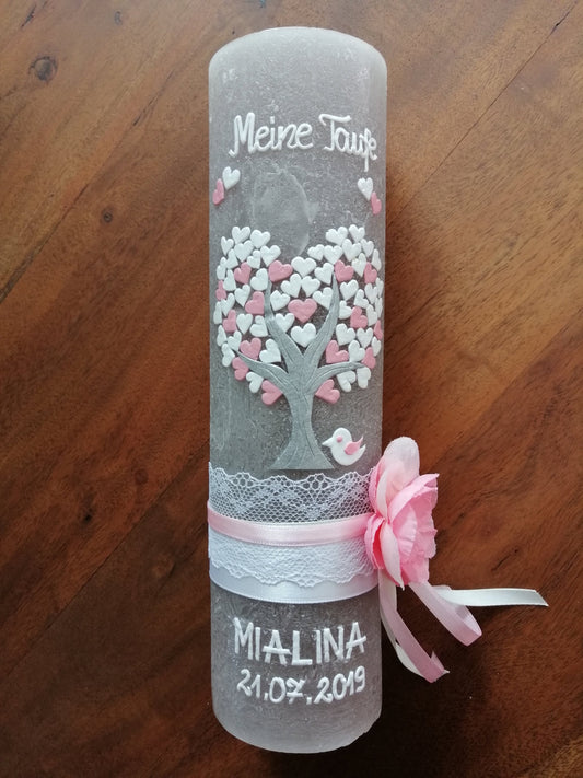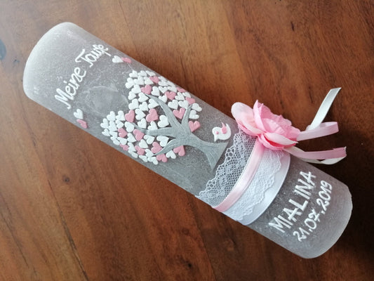Taufkerze Rustikal, Mädchen, Kreuz, Fisch, Herz, rosa, Farbwünsche möglich, auch für Jungen möglich