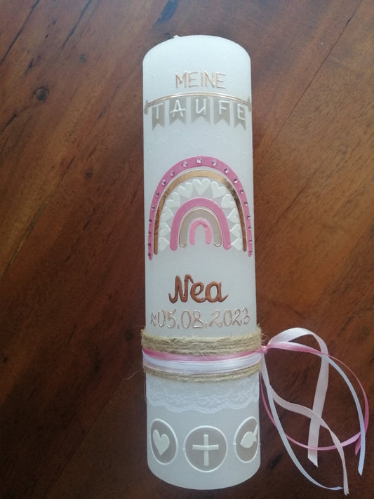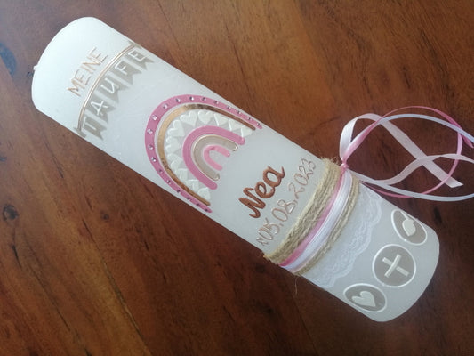 Taufkerze Rustica Vintage-Look Shabby Rustikal, Regenbogen Mädchen rosa Farbwünsche auch für Jungen inkl Wachsbeschriftung