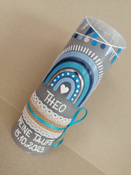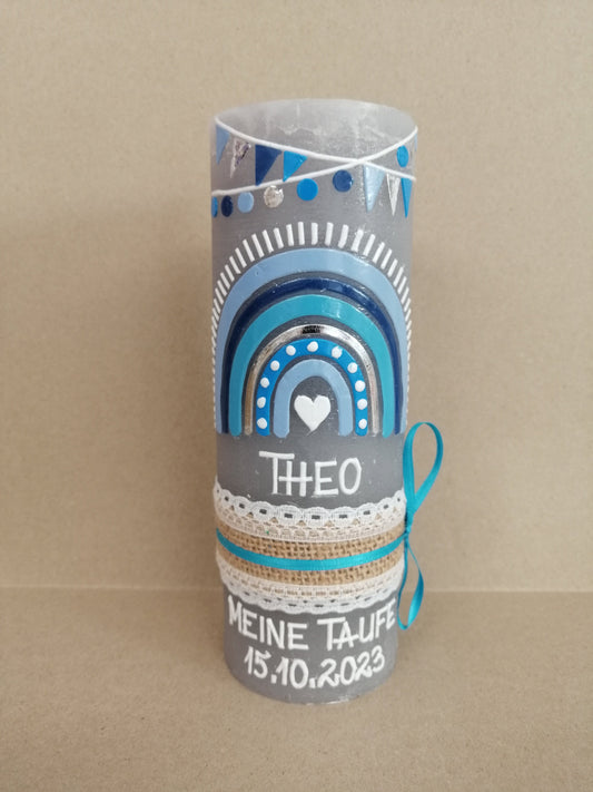 Taufkerze Rustica Vintage-Look Shabby Rustikal, Regenbogen Jungen blau Farbwünsche auch für Mädchen inkl Wachsbeschriftung