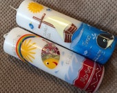 Creative, unusual sibling baptism candles. Very well crafted. Thanks to the delicate wax design (instead of foil printing), they were by far the highest quality in the baptism group. The service was excellent! Our tight deadline was met. Responses to queries were prompt. Highly recommended!
