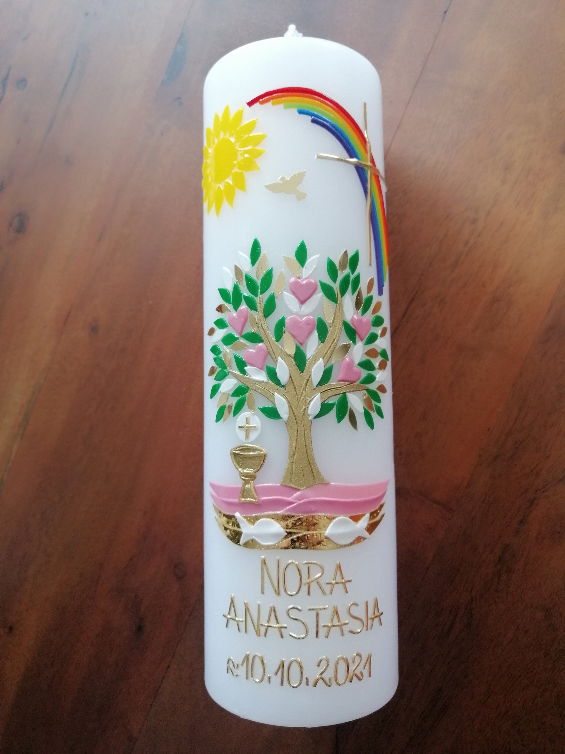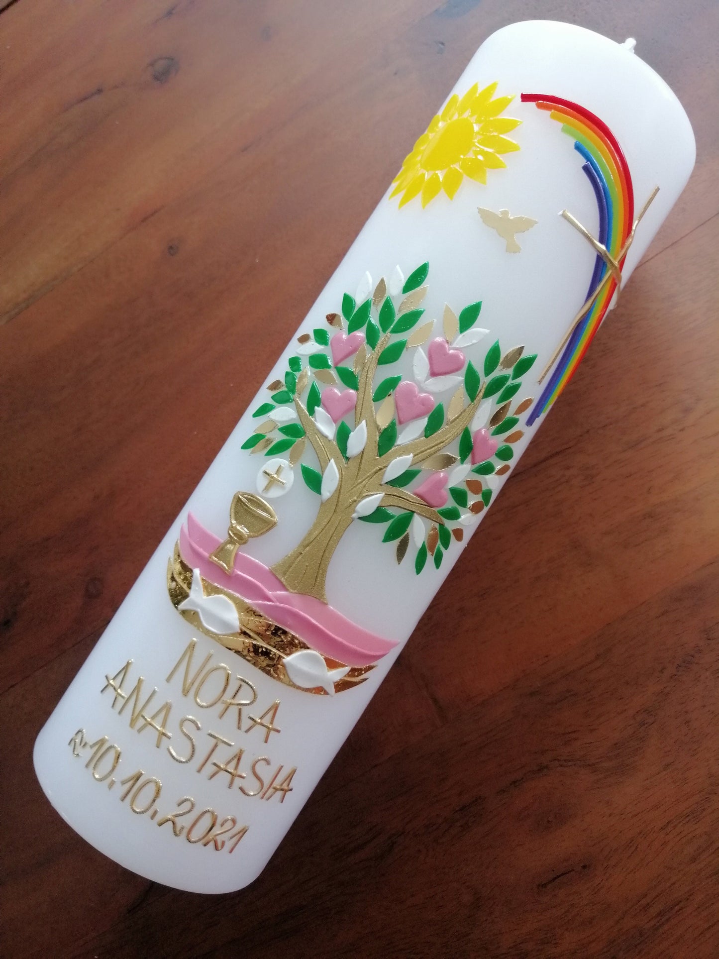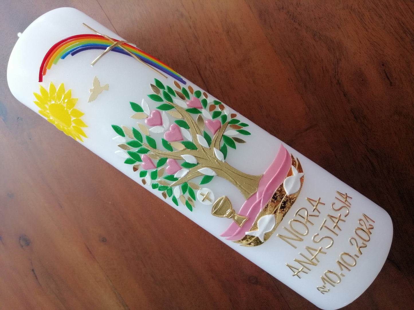 Bei unseren Baum-Kommunionkerze/Taufkerzen handelt es sich um hochwertige Handarbeit.