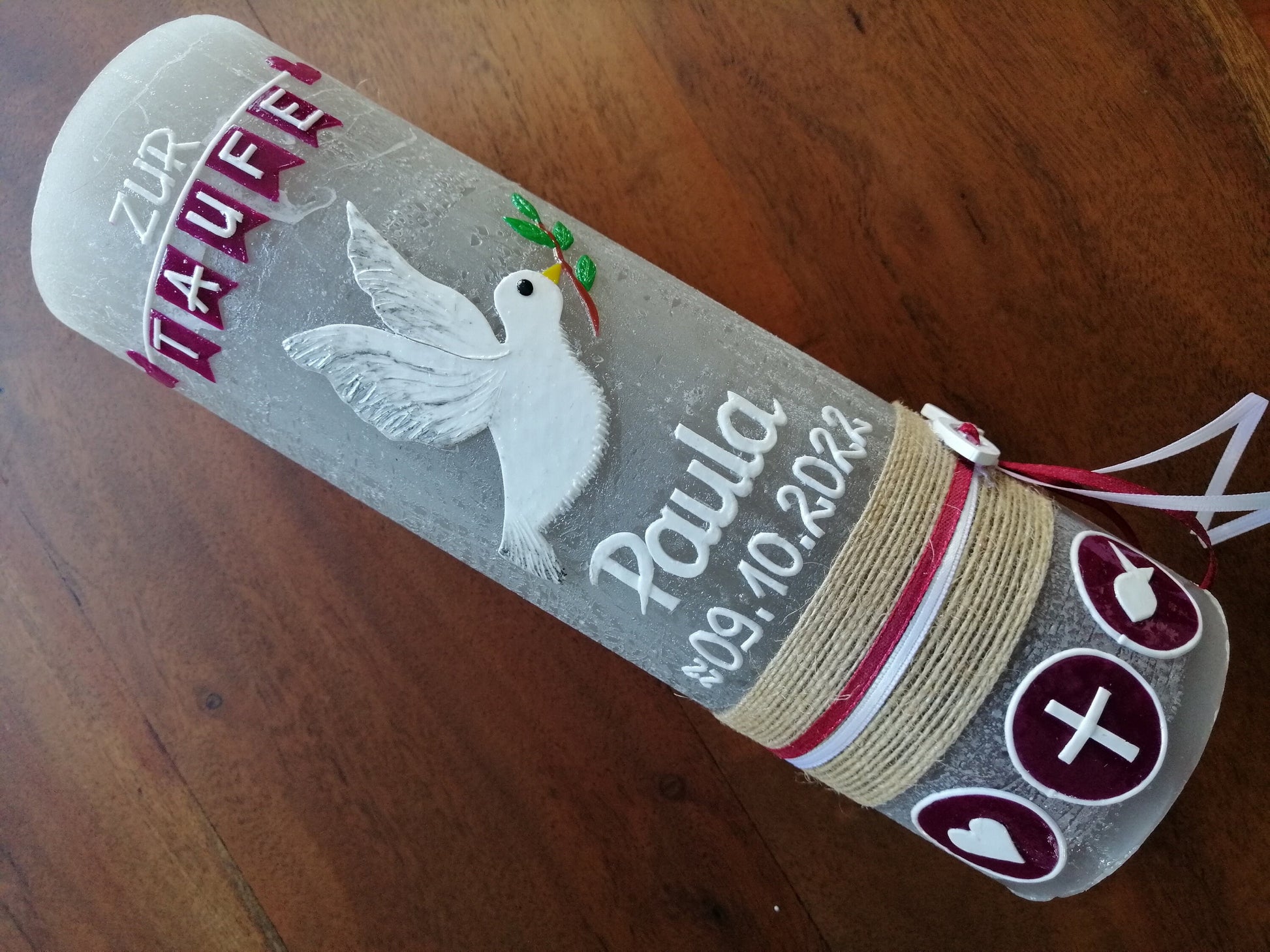 RUSTICA, VINTAGE-Look, SHABBY, Rustikal, Taufkerze, Friedenstaube, Taube, Mädchen, Junge, Brombeere, Wachsbeschriftung, Farbwünsche möglich