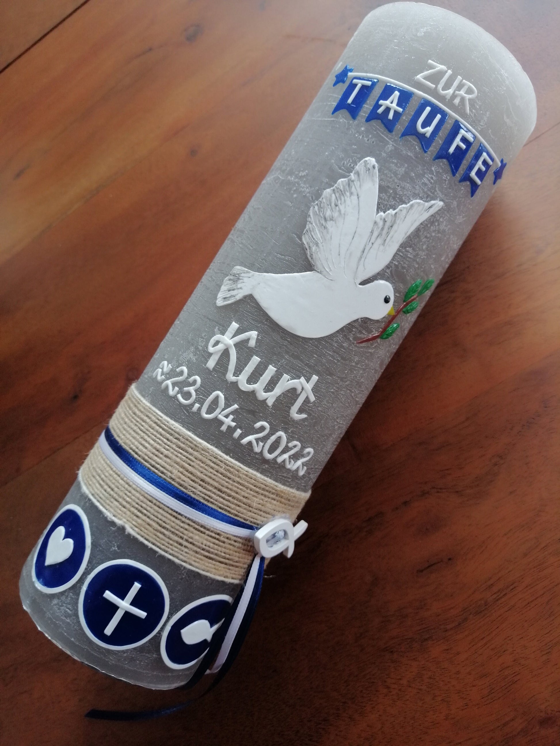 I've ordered baptism candles for all three of my children here, and I'm always very satisfied. My changes and requests are always implemented perfectly, so I can look forward to a beautiful and unique baptism candle. Contact is quick, and the candle is delivered on time. Thank you very much!