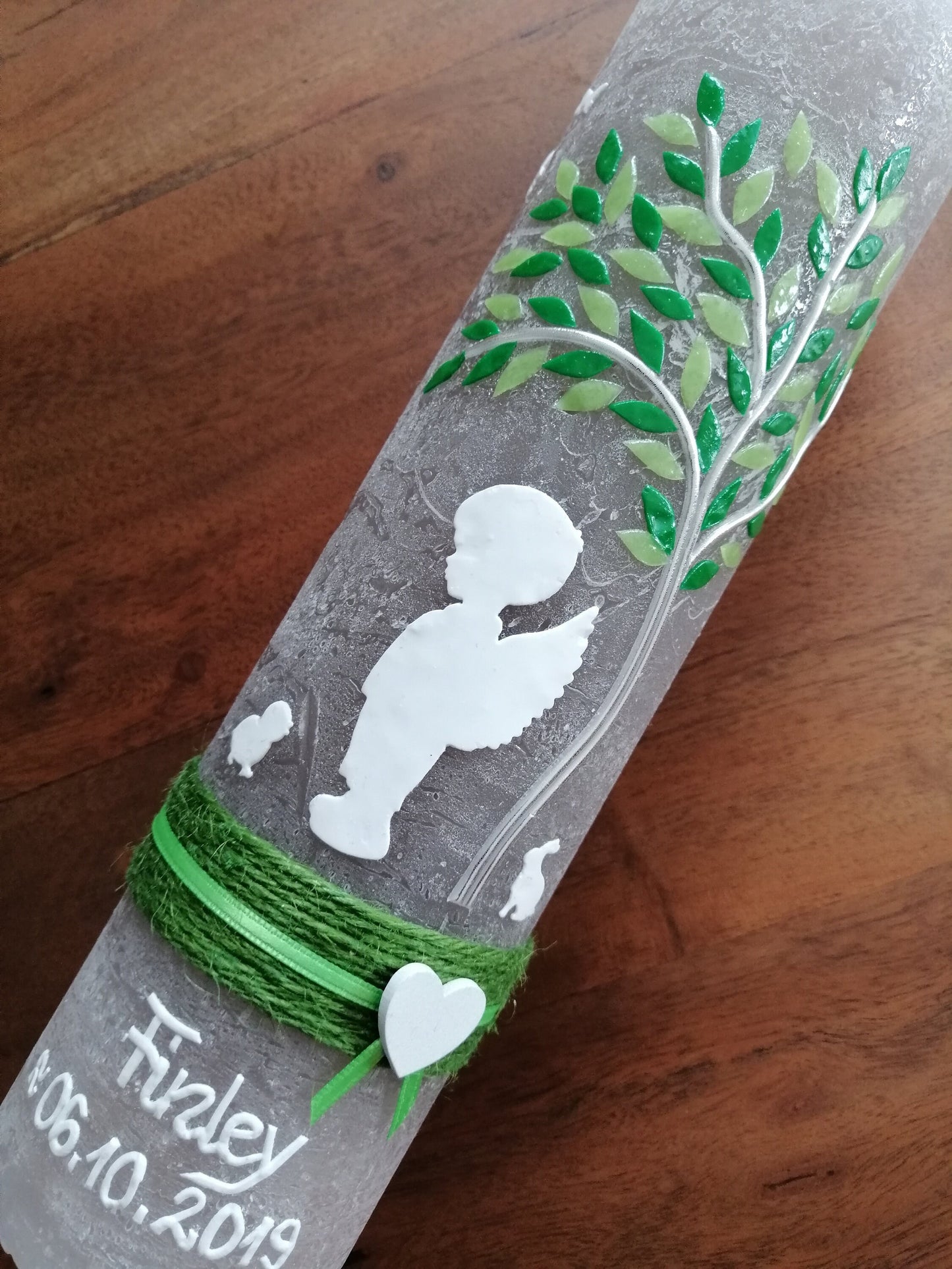 Taufkerze Lebensbaum mit Schutzengel, hochwertige Wachsverzierungen