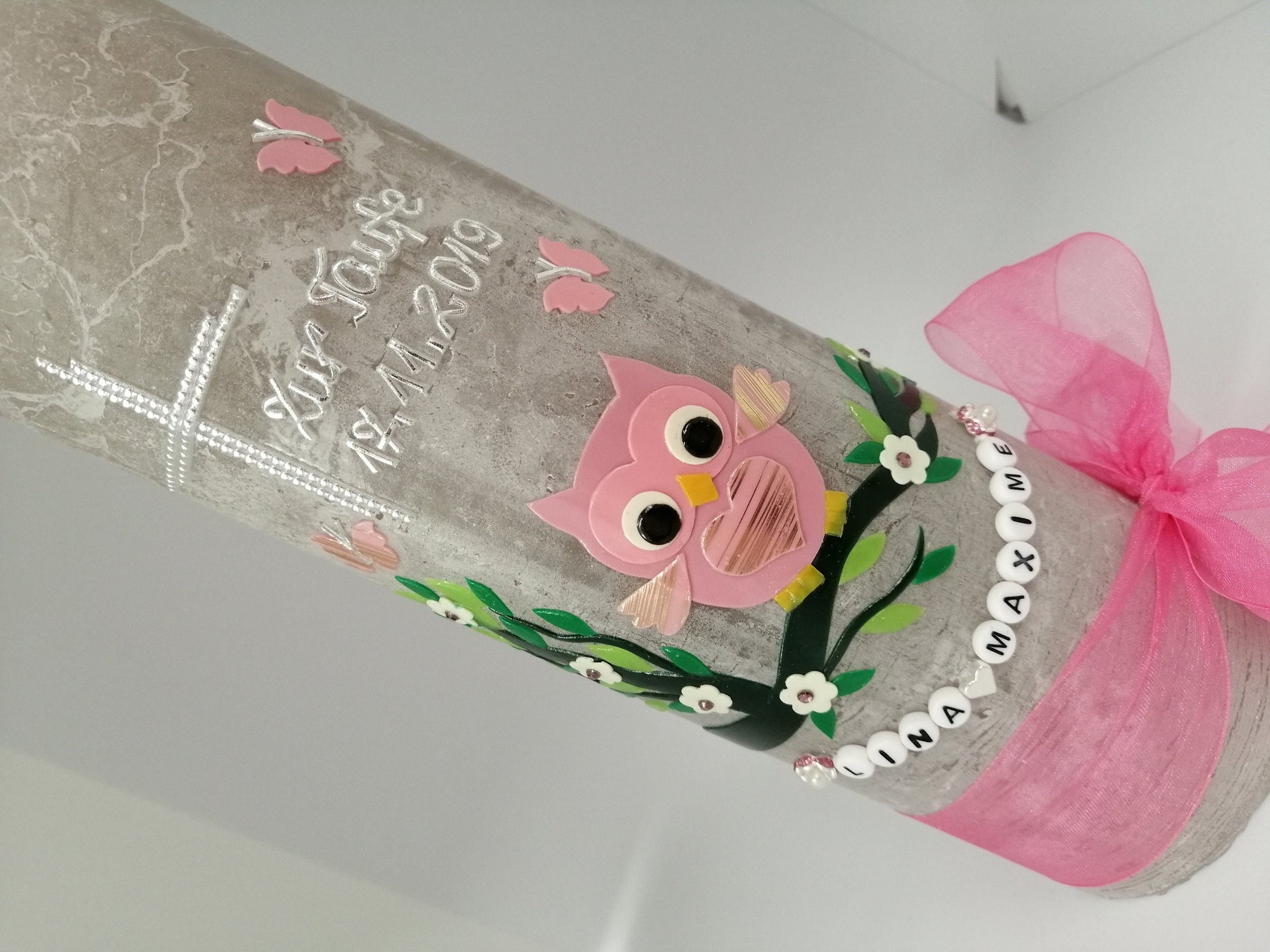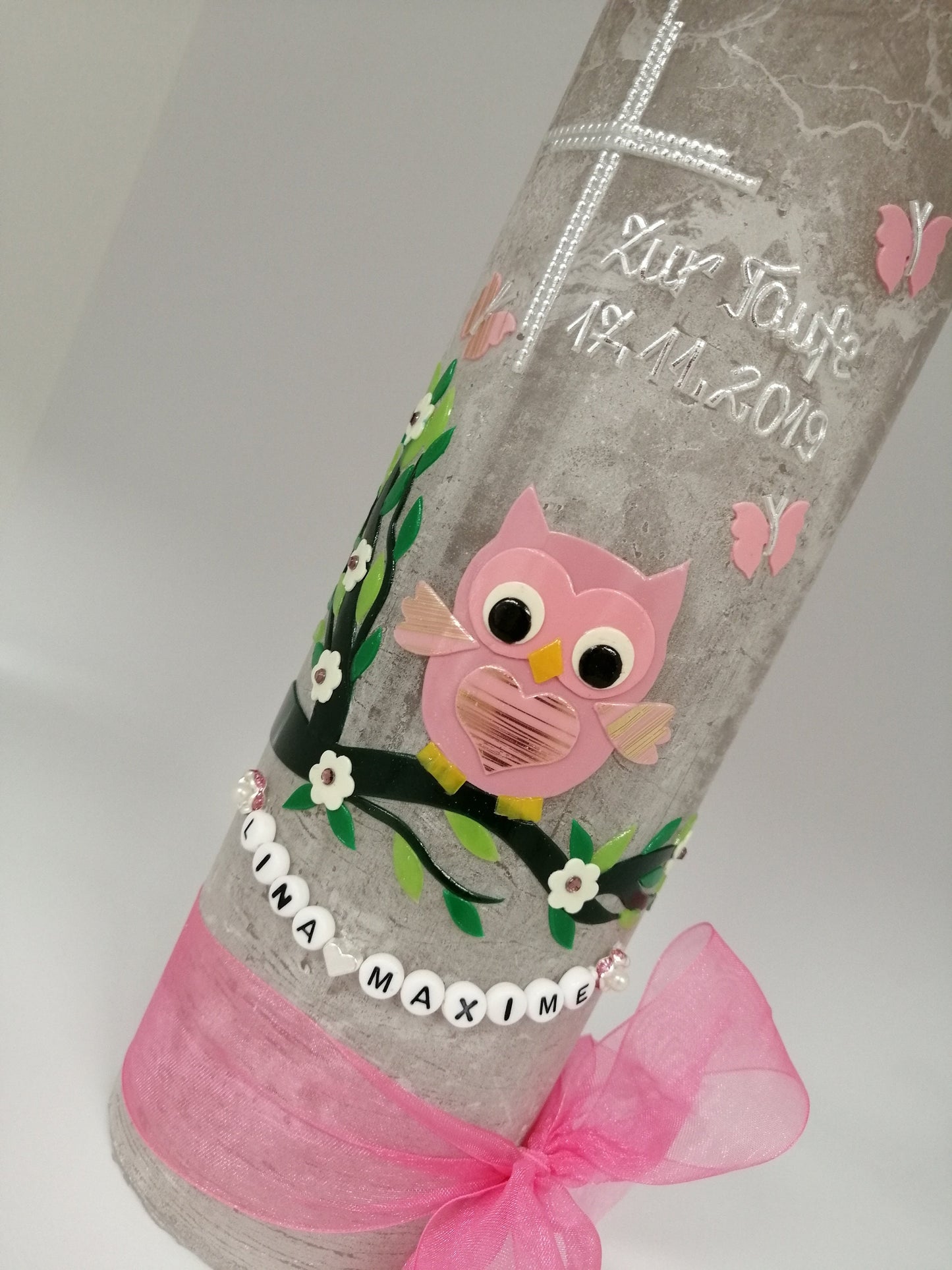 Taufkerze Eule mit hochwertigen Wachsverzierungen