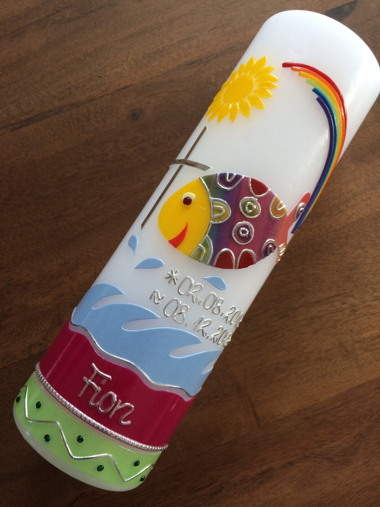 Taufkerze - bunter Fisch - Wasser - Mädchen - Kerze - Taufe - Handarbeit - keine Folie - inkl. Wachsbeschriftung