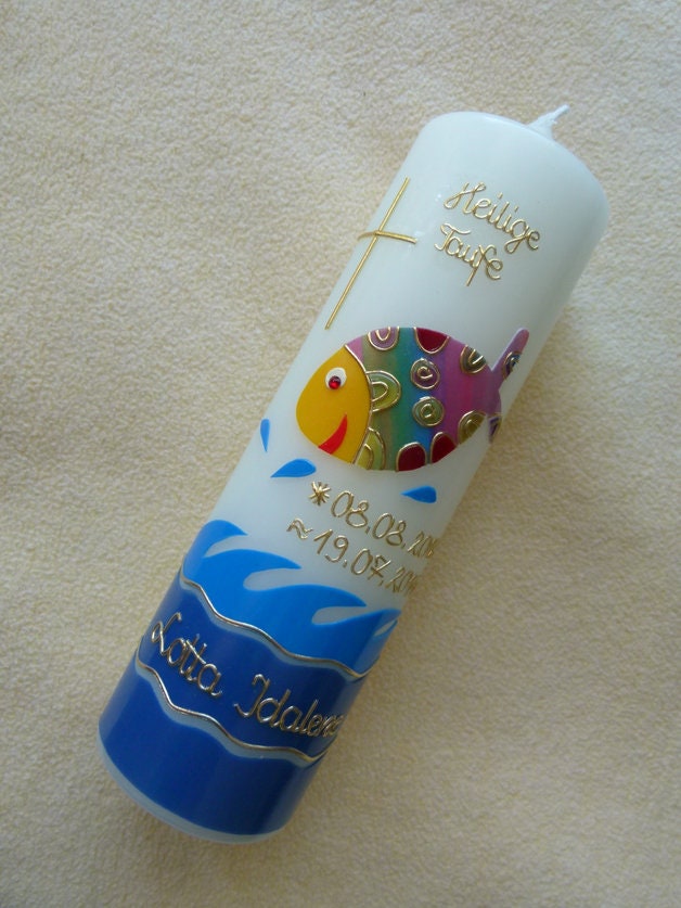 Taufkerze bunter Fisch mit hochwertigen Wachsverzierungen