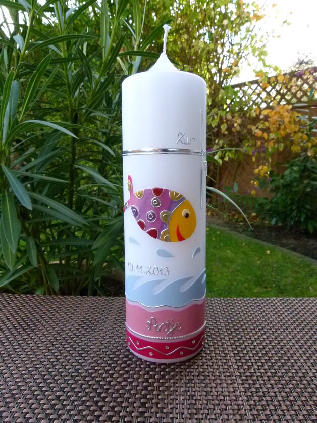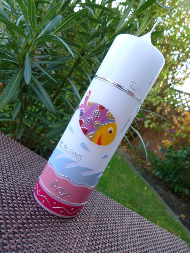 Taufkerze - bunter Fisch - Wasser - Mädchen - Kerze - Taufe - Handarbeit - keine Folie - inkl. Wachsbeschriftung