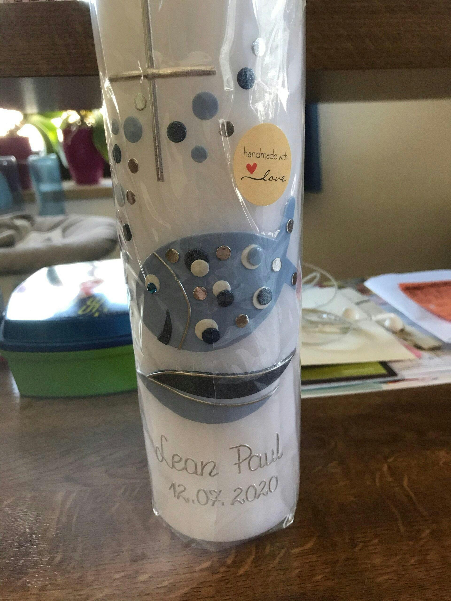 I've ordered baptism candles for all three of my children here, and I'm always very satisfied. My changes and requests are always implemented perfectly, so I can look forward to a beautiful and unique baptism candle. Contact is quick, and the candle is delivered on time. Thank you very much!
