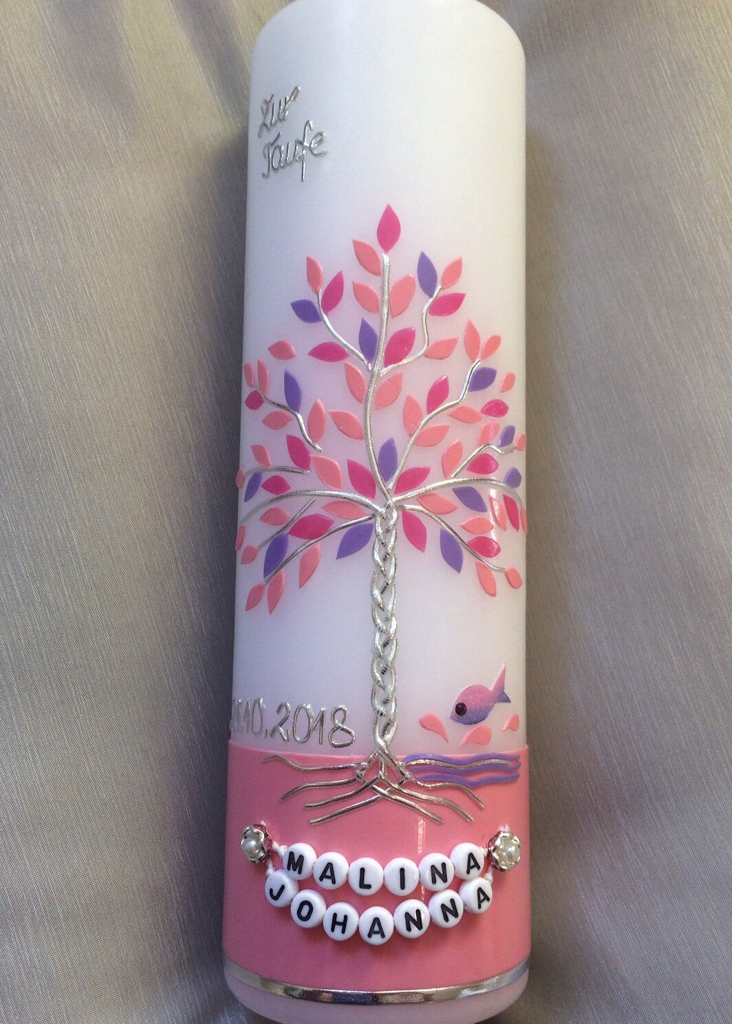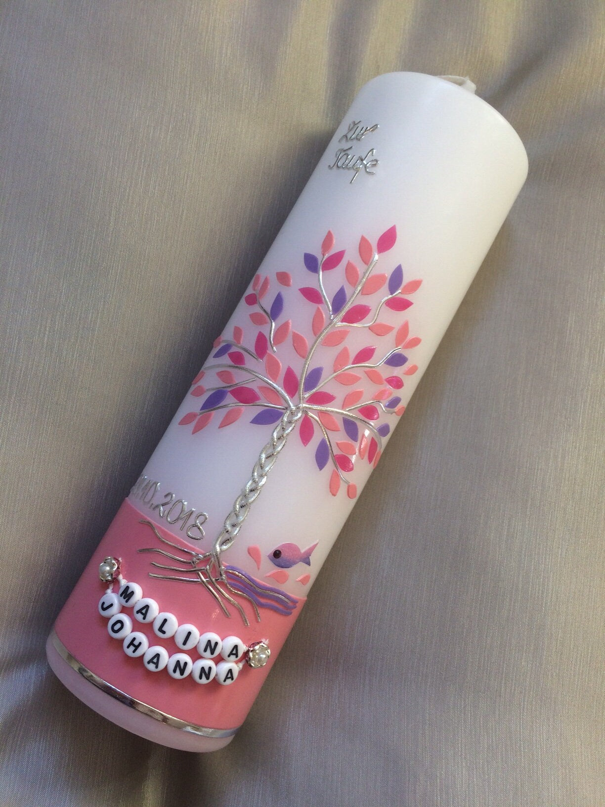 Taufkerze Lebensbaum Baum Mädchen Junge Kerze - Taufe - Handarbeit - keine Folie - Buchstabenperlen - Wachsbeschriftung möglich