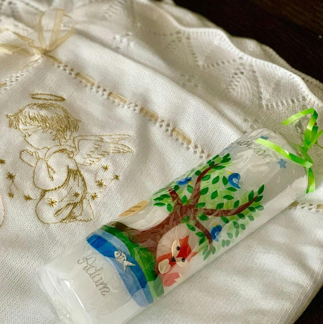 The christening saying was beautifully decorated. I thought the price was a bit high considering it was "only" printed and not made of wax letters (we were aware of this beforehand, of course), but we definitely wanted it on the candle.