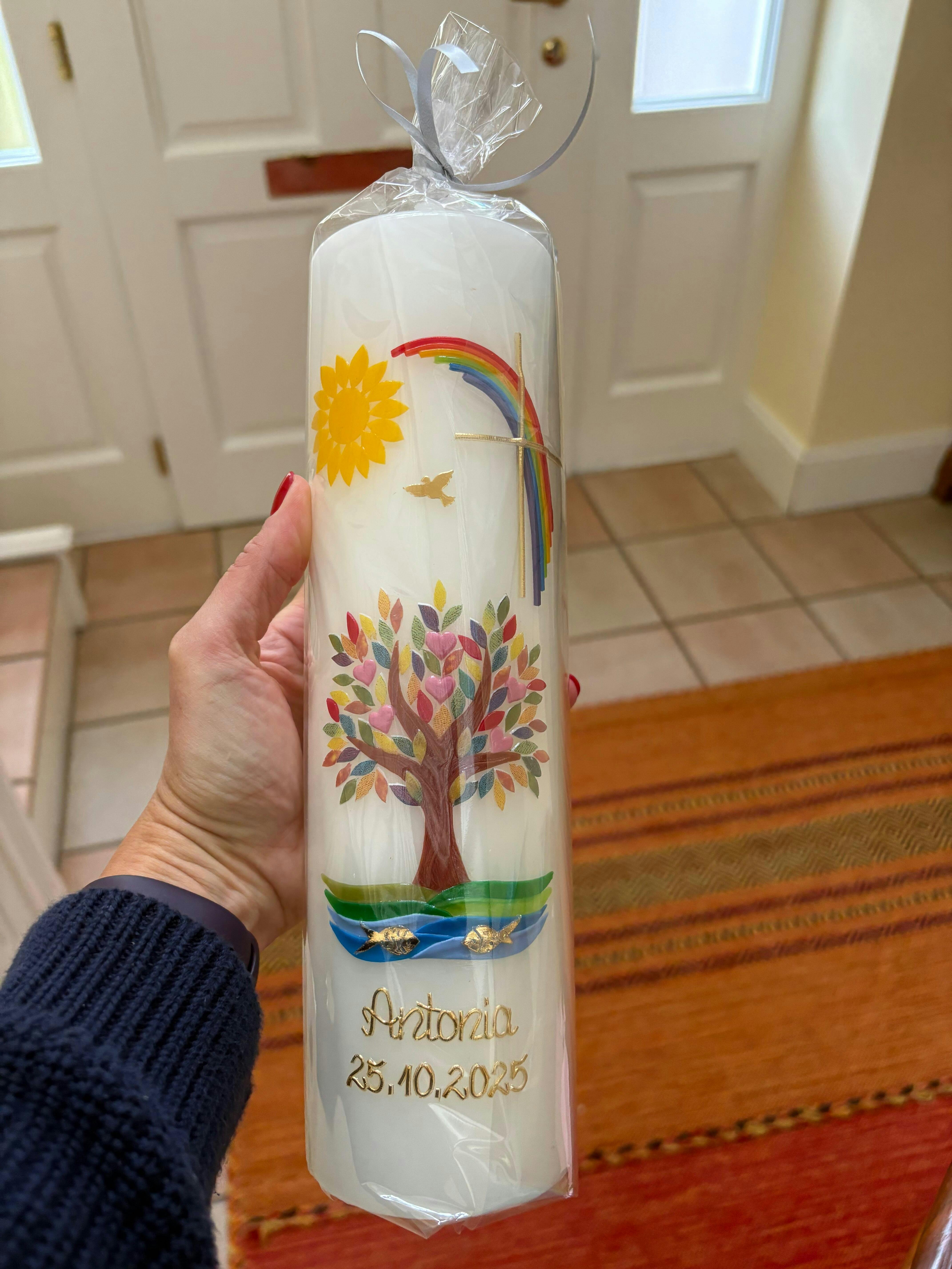 Die Taufkerze Baum ist 30 x 8 cm groß.